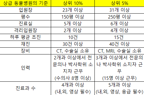 ‘상위 5% 기준 동물병원’은 입원장 31개 이상, 250평 이상, 진료실 6개 이상, 격리입원장 4개 이상, CT, MRI, 수술실 등의 시설을 보유하고, 15명 이상의 수의사가 근무, 3개과 이상에서 전문의나 박사학위 소지자가 있어야 한다. 진료과 수는 내, 외, 영상, 응급학과를 필수로 5개과 이상 있어야 하고, 하루 평균 초진 15건, 재진 40건 이상을 진료해야 한다.