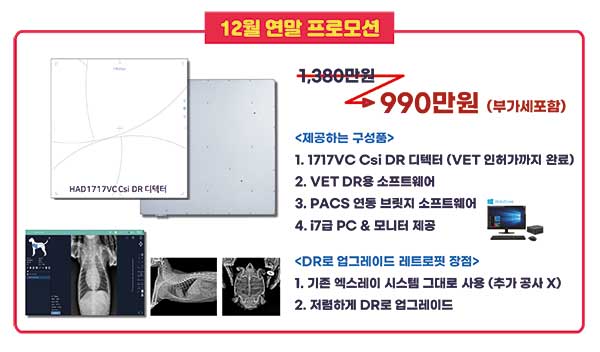 제공하는 구성품은 △VET 인허가가 완료된 1717VC Csi DR 디텍터 △VET DR용 소프트웨어 △PACS 연동 브릿지 소프트웨어 △i7급 PC&모니터다.