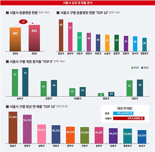 2023년 말 기준 서울시 내 동물병원 수는 총 894개다. 그 중 강남구 일대는 서울에서 가장 많은 85개소의 동물병원이 자리하고 있다. 2022년과 비교했을 때 2개소가 늘어난 수치다. 강남구는 다른 지역에 비해 높은 임대료 등 여러 부담 요소로 인해 1년을 못 채우고 폐업하는 경우가 많다.