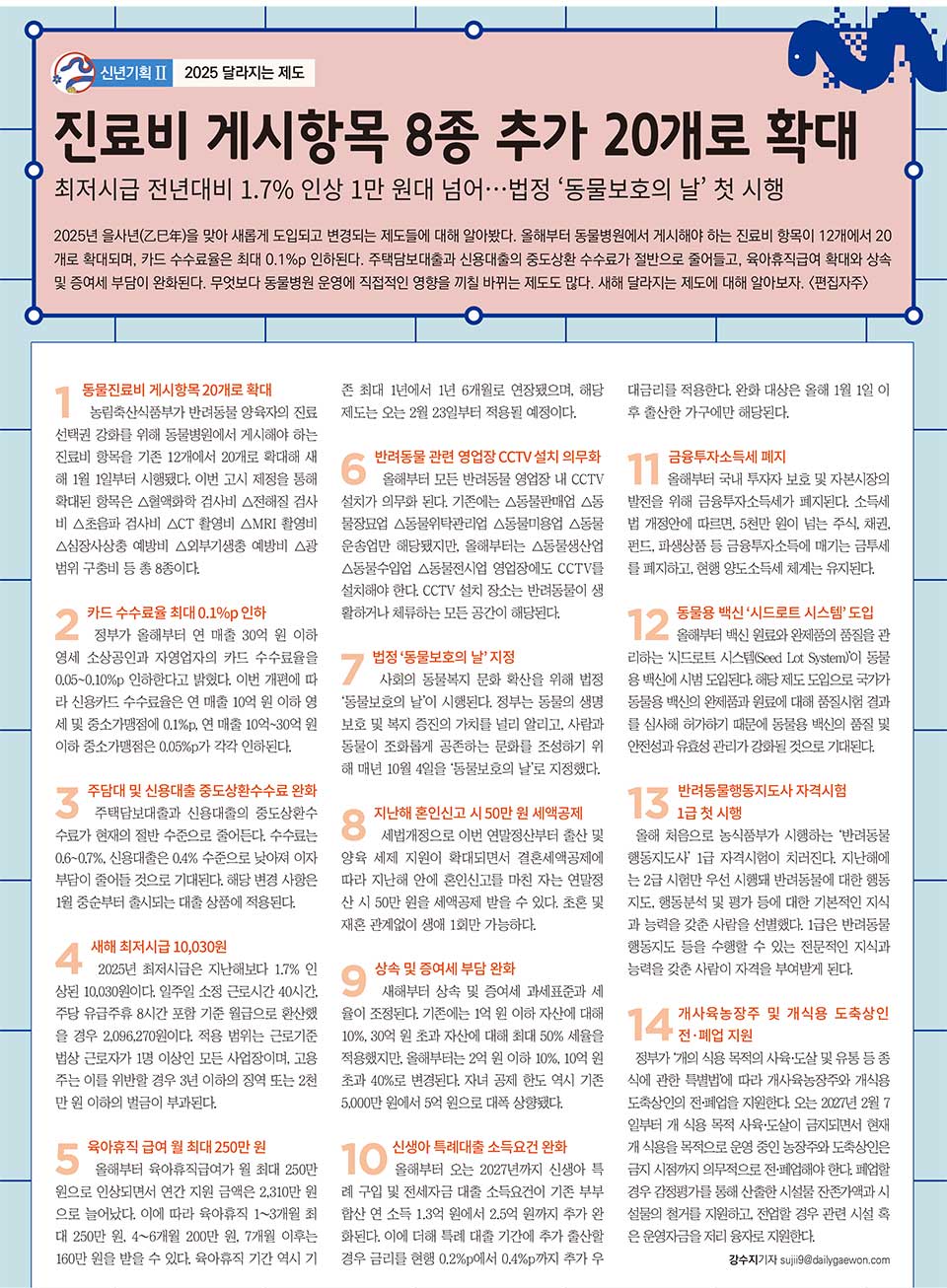 2025년 을사년(乙巳年)을 맞아 새롭게 도입되고 변경되는 제도들에 대해 알아봤다. 올해부터 동물병원에서 게시해야 하는 진료비 항목이 12개에서 20개로 확대되며, 카드 수수료율은 최대 0.1%p 인하된다. 주택담보대출과 신용대출의 중도상환 수수료가 절반으로 줄어들고, 육아휴직급여 확대와 상속 및 증여세 부담이 완화된다. 무엇보다 동물병원 운영에 직접적인 영향을 끼칠 바뀌는 제도도 많다. 새해 달라지는 제도에 대해 알아보자. <편집자주>