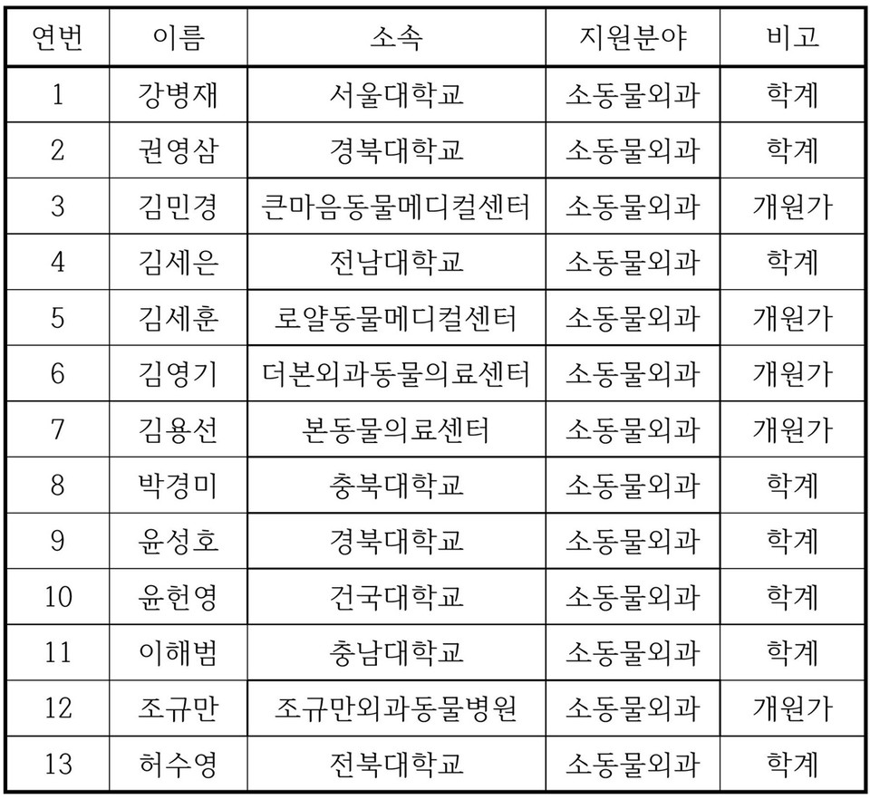 공고에 따르면, 이번 인정전문의 선정자는 강병재(서울대)·권영삼(경북대)·김세은(전남대)·박경미(충북대)·윤성호(경북대)·윤헌영(건국대)·이해범(충남대)·허수영(전북대) 교수, 김민경(큰마음동물메디컬센터)·김세훈(로얄동물메디컬센터)·김영기(더본외과동물의료센터)·김용선(본동물의료센터)·조규만(조규만외과동물병원) 원장 등 총 13명이다.