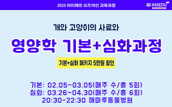 아이해듀 오프라인 교육과정 ‘개와 고양이의 사료와 영양학 기본+심화과정’이 매주 수요일 오후 8시 30분부터 10시 30분까지 해마루동물병원에서 진행된다.