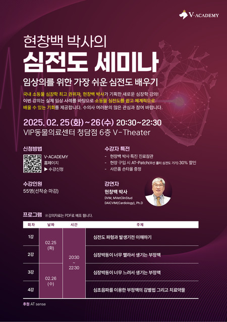 글로벌 수의학 교육기관 V-ACADEMY에서 2월 25일(화)~26일(수) 양일간 오후 8시 30분부터 10시 30분까지 수의사 대상 ‘심전도 세미나’를 개최한다.