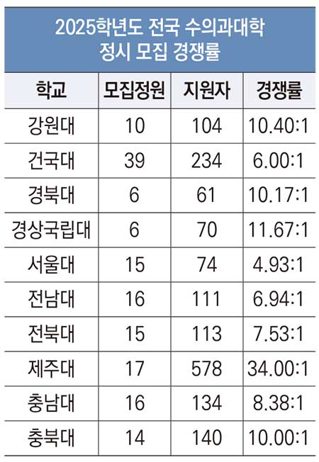 전국 10개 수의대 중 가장 높은 경쟁률을 기록한 대학은 제주대로 5년 연속 경쟁률 1위를 차지했다. 유일한 다군 모집 대학인 제주대는 17명 모집에 578명의 지원자가 몰리며 34대 1의 경쟁률을 기록했다.