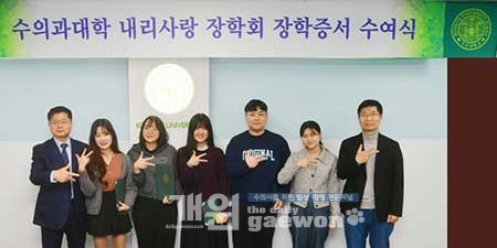 건국대학교 수의과대학(학장 최양규)이 지난해 12월 13일 ‘수의과대학 내리사랑 장학금’ 수여식을 개최하고, 수의학과 재학생 5명에게 총 1,000만 원 상당의 장학금을 전달했다. 내리사랑 장학금은 건국대 수의대 교수들이 제자들의 학업 의지를 높이기 위해 2010년 3월부터 매월 월급에서 일정액을 적립하기 시작한 장학기금이다.
