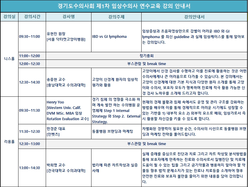 이번 연수교육은 2개의 강의실에서 총 5개의 강의를 진행, 제1강의실에서는 유현진(서울 닥터캣고양이병원) 원장이 ‘IBD vs GI Iymphoma’ 강의를, 송중현(충남대) 교수가 ‘고양이 신경계 검사’ 강의를 진행할 예정이다.