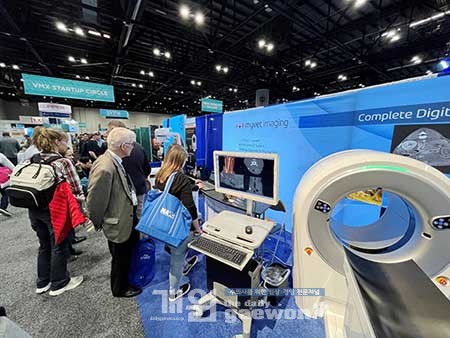 그 중에서도 새롭게 선보인 동물 전용 엑스레이 테이블 ‘MyVet Table 32+’와 세계 최초의 Spiral Inear 동물용 CT ‘MyVet CT i3D’가 주목받았다.