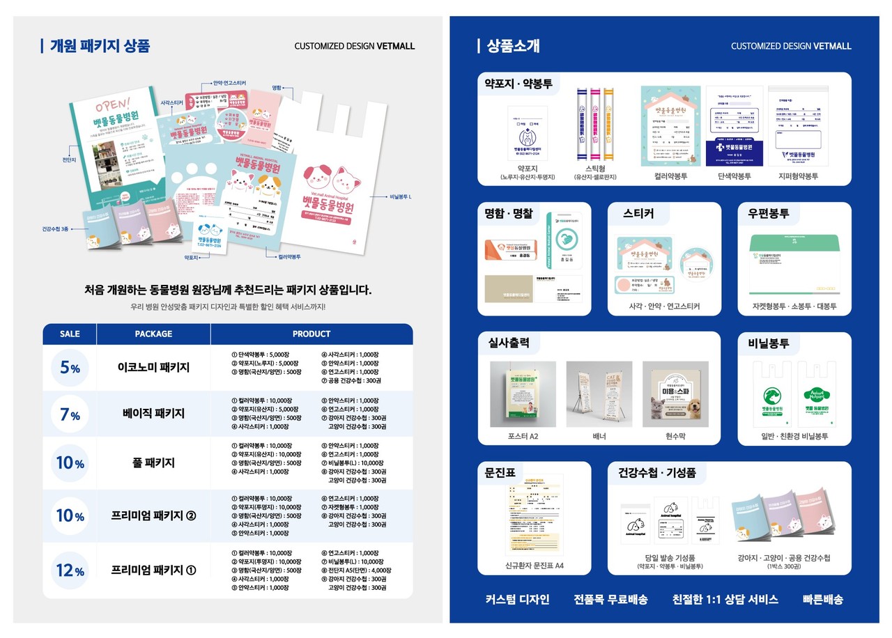 ‘벳몰’은 전문 인쇄물인 약포지, 약봉투, 명함, 스티커, 우편봉투, 비닐봉투, 건강수첩 등을 비롯해 동물병원 홍보를 위한 기념품, 전단 등을 제작, 공급하고 있다. 특히 카카오톡 채널을 통해 전문 디자이너와 일대일로 소통하면서 맞춤 디자인 서비스를 받아볼 수 있는 것이 ‘벳몰’의 강점으로 맞춤 디자인 비용은 무료로 진행된다.