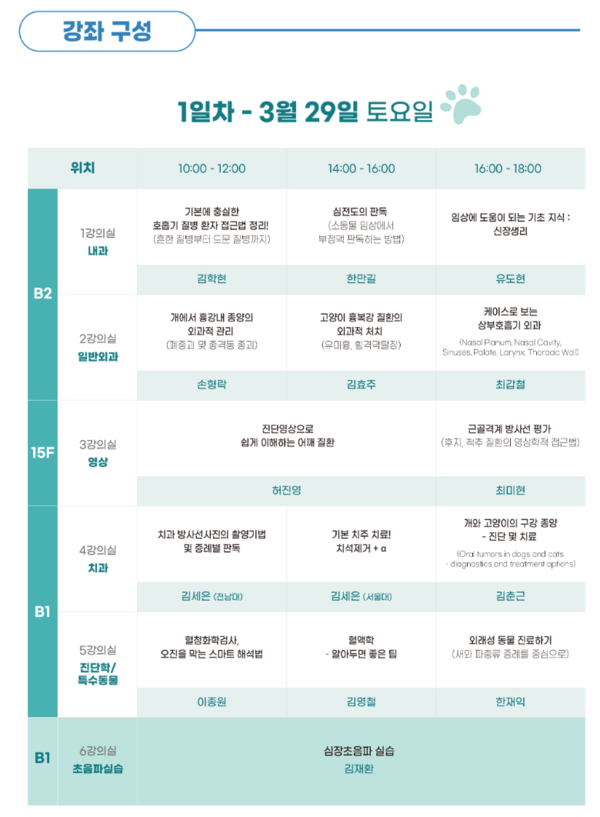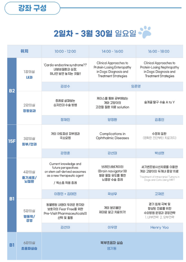 둘째 날인 30일(일) ‘내과’ 강의가 진행되는 1강의실에서는 김성수(VIP동물의료센터 심장·신장센터) 원장이 ‘내분비질환과 심장, 하나만 보면 놓치는 것들’을, 임준영(VetsGo) 대표가 ‘Clinical Approaches to Protein-Losing Enteropathy in Dogs: Diagnosis and Treatment Strategies’를 강의하고, ‘정형외과’ 테마의 2강의실에서는 정재민(충남대) 교수가 ‘증례로 살펴보는 십자인대 수술 방법’을, 양정환(서울동물의료센터) 원장이 ‘케이스를 통해 공부해보는 개와 고양이의 고관절 질환 치료 solution’을, 김종인(VIP동물의료센터 청담점) 원장이 ‘슬개골 탈구 수술 A to Y’에 대해 강의한다.