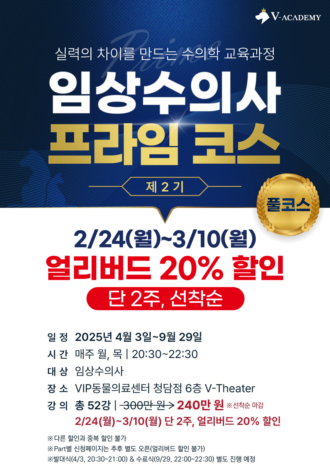 VIP동물의료센터(대표원장 최이돈)가 설립한 글로벌 수의학 교육기관 V-ACADEMY가 임상수의사들의 실전 역량 강화를 위한 전문 교육과정 ‘임상수의사 프라임 코스 제2기’ 수강생을 모집한다.