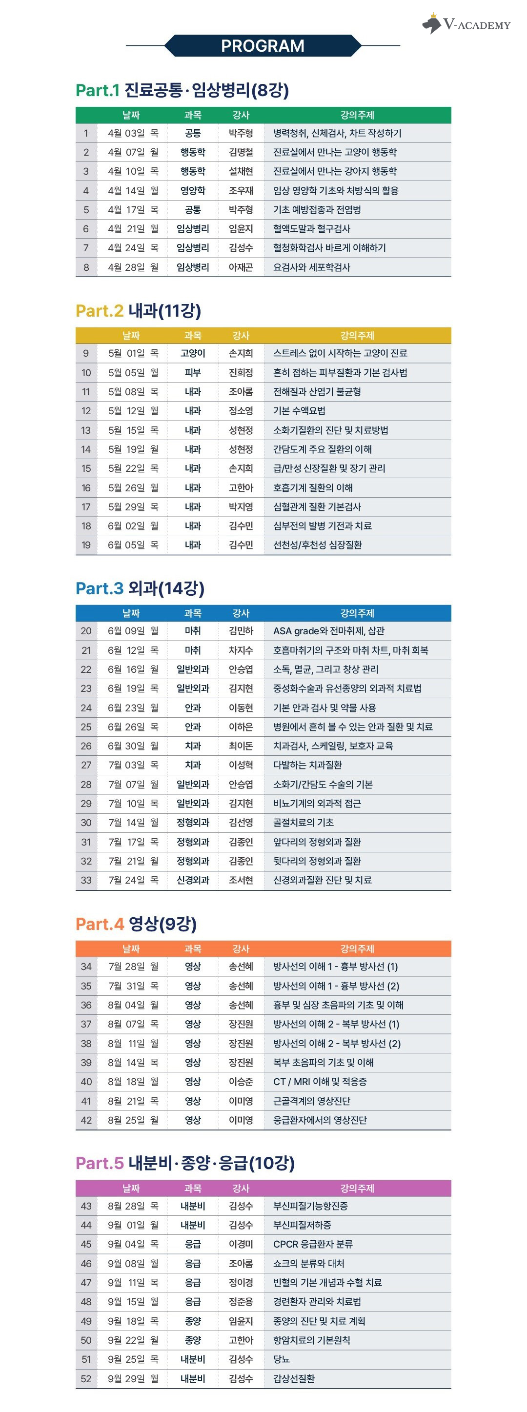 V-ACADEMY 관계자에 따르면, 이번 임상수의사 프라임 코스는 지난해보다 2강 더 늘어난 총 52강으로 △진료 공통·임상병리 △내과 △외과 △영상 △내분비·종양·응급 등 총 5개 파트로 세분화해 더욱 탄탄한 커리큘럼으로 구성하는 데 주력했다.