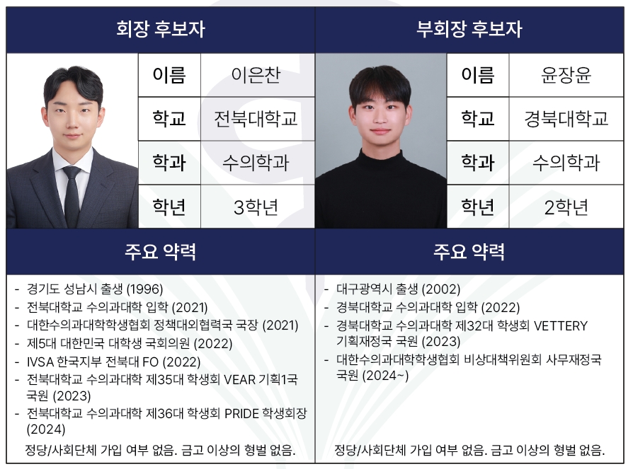 대한수의과대학학생협회(이하 수대협) 제5대 회장단 선거에 단독 출마한 이은찬(전북대 수의학과 3년) 회장 후보와 윤장윤(경북대 수의학과 2년) 부회장 후보가 당선됐다.