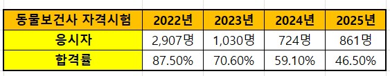 시험은 △기초 동물보건학 △예방 동물보건학 △임상 동물보건학 △동물보건·윤리 및 복지 관련 법규 총 4개 과목에서 200문제가 출제되며, 200점 만점이다. 전과목 60% 이상과 과목별 점수 40% 이상을 득점해야 합격 기준을 충족할 수 있다.