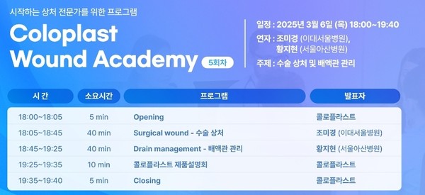 글로벌의료기기 기업 콜로플라스트(Coloplast)가 ‘제5회 Coloplast Wound Academy’ 웨비나를 오는 3월 6일(목) 오후 6시부터 7시 40분까지 진행한다.