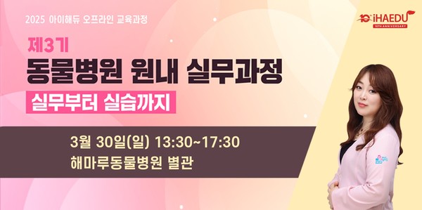 아이해듀가 ‘제3기 동물병원 원내 실무과정’을 오는 3월 30일(일) 오후 1시 30분부터 5시 30분까지 해마루동물병원 별관에서 진행한다.