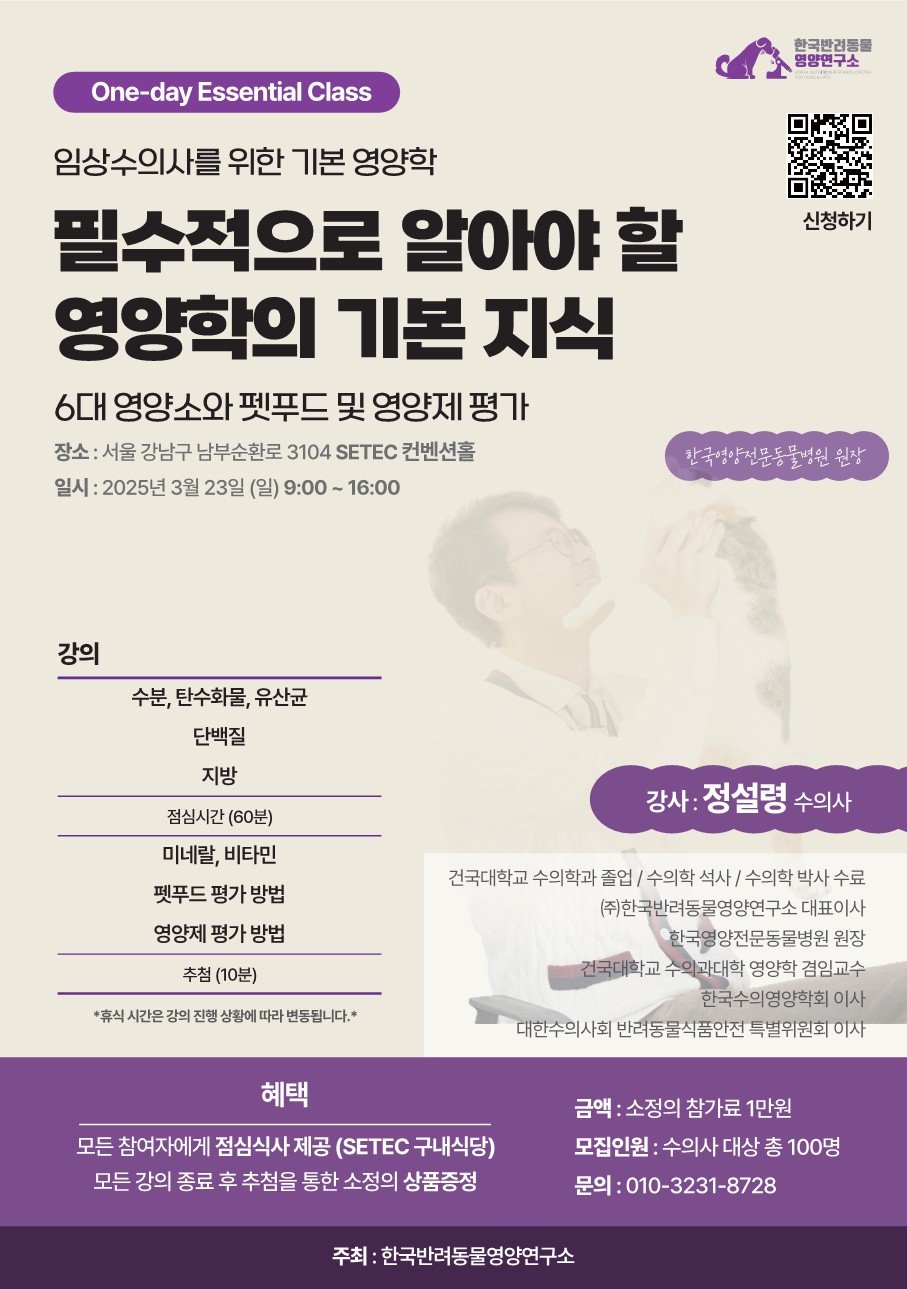 한국반려동물영양연구소(대표 정설령)가 임상의들을 위한 기본 영양학 ‘One-day Essential Class’를 오는 3월 23일(일) SETEC 컨벤션홀에서 개최한다.