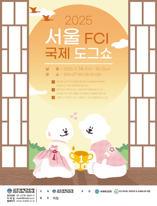 한국애견연맹(총재 송하경)이 오는 3월 14일(금)부터 16(일)일까지 양재 aT센터에서 ‘2025 서울 FCI 국제 도그쇼 및 KKF 챔피언십 도그쇼’를 개최한다.