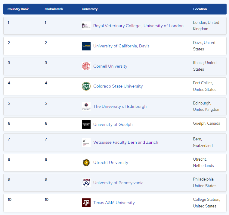 이 밖에 콜로라도주립대학교가 90.7점으로 4위를, 에든버러대학교가 90.6점으로 5위를 차지했으며, △궬프대학교 △베른-취히리연합수의과대학 △위트레흐트대학교 △펜실베니아대학교 △텍사스 A&M대학교 등이 10위권에 이름을 올렸다.