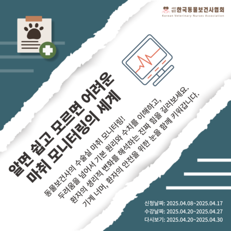 한국동물보건사협회(회장 김수연, 이하 동보협)가 ‘알면 쉽고 모르면 어려운 마취 모니터링의 세계’ 웨비나를 4월 20일(일)부터 30일(수)까지 10일간 진행한다.