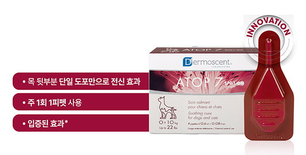 ‘아톱 7 스팟온’은 아토피 및 알러지성 피부염으로 인해 손상된 피부 장벽을 회복시키고 수분 공급에 도움을 주는 제품으로 해당 제품을 사용하면 피부 장벽 회복을 통해 알러젠 침투 차단 및 수분 손실을 방지할 수 있다. 특히 소양증 완화제나 소염제와 함께 사용하면 더욱 높은 효과를 볼 수 있다.
