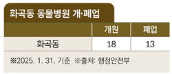 행정안전부 최신 데이터에 따르면, 강서구 화곡동은 1995년부터 동물병원이 개원하기 시작해 2025년 1월 31일 기준 총 31개소가 개원, 이 중 13개소(42%)가 문을 닫고, 현재 18개소(58%)가 개원을 유지하고 있다.
