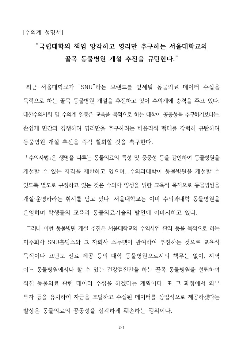 대수회는 “최근 서울대가 ‘SNU’라는 브랜드를 앞세워 동물의료 데이터 수집을 목적으로 하는 골목 동물병원 개설을 추진하고 있어 수의계에 충격을 주고 있다. 대수회 및 수의계 일동은 교육을 목적으로 하는 대학이 공공성을 추구하기보다는 손쉽게 민간과 경쟁하며 영리만을 추구하려는 비윤리적 행태를 강력히 규탄하며, 동물병원 개설 추진을 즉각 철회할 것을 촉구한다”고 피력했다.