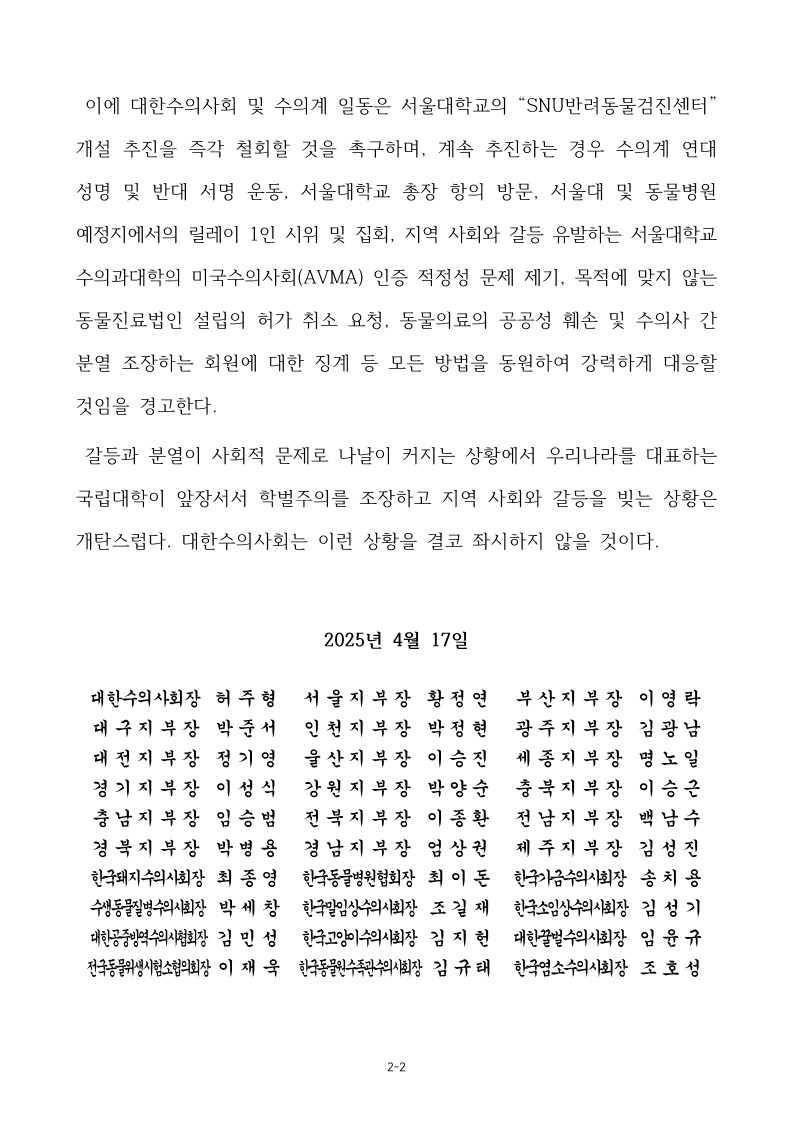 이에 대수회 및 수의계 일동은 서울대의 ‘SNU반려동물헬스케어센터’ 개설 추진을 즉각 철회할 것을 촉구하며, 계속 추진할 경우 △수의계 연대 성명 및 반대 서명 운동 △서울대 총장 항의 방문 △서울대 및 동물병원 예정지에서의 릴레이 1인 시위 및 집회 △지역 사회와 갈등 유발하는 서울대 수의대의 AVMA(미국수의사회) 인증 적정성 문제 제기 △목적에 맞지 않는 동물진료법인 설립의 허가 취소 요청 △동물의료의 공공성 훼손 및 수의사 간 분열 조장하는 회원에 대한 징계 요청 등 모든 방법을 동원해 강력하게 대응할 것을 예고했다.