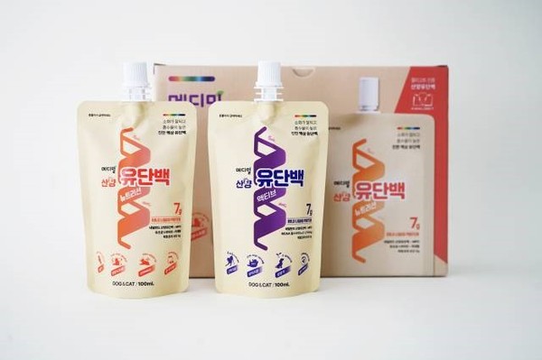 건국대 LINC+ 사업단과 공동으로 세계 최초 반려동물 펫두유를 개발한 ㈜메디밀(대표 왕주호)이 신제품 액상 펫프로틴 ‘산양유단백’ 뉴트리션과 액티브 2종을 출시한다.