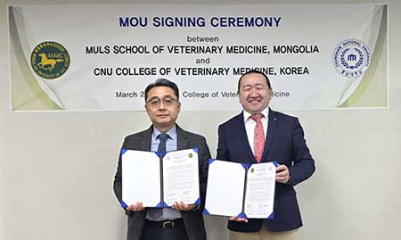 충남대학교 수의과대학(학장 정주영)이 지난 3월 25일 몽골국립생명과학대학교(학장 Erdene-Ochir Tseren-Ochir, MULS) 수의과대학과 수의학 분야 공동연구 및 인적 교류 확대를 위한 업무협약을 체결했다.