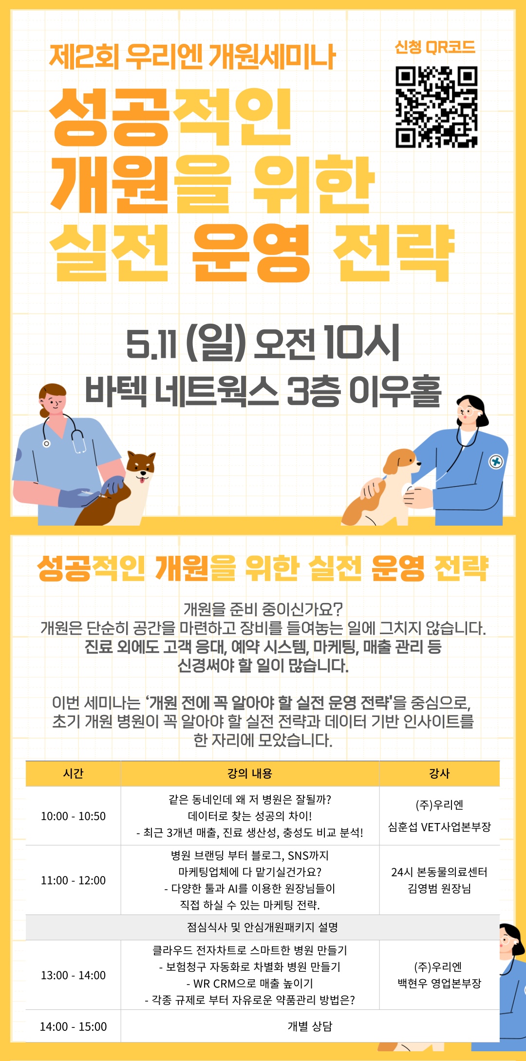 이번 세미나 참가 대상은 2년 이내에 개원을 계획 중인 수의사로 오는 5월 7일(수)까지 QR코드 또는 우리엔 카카오톡 채널을 통해 신청하면 된다.