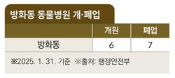 행정안전부 최신 데이터에 따르면, 강서구 방화동은 2000년부터 동물병원이 개원하기 시작해 2025년 1월 31일 기준 13개소가 개원, 이 중 7개소(54%)가 문을 닫고, 현재 6개소(46%)가 개원을 유지하고 있다.