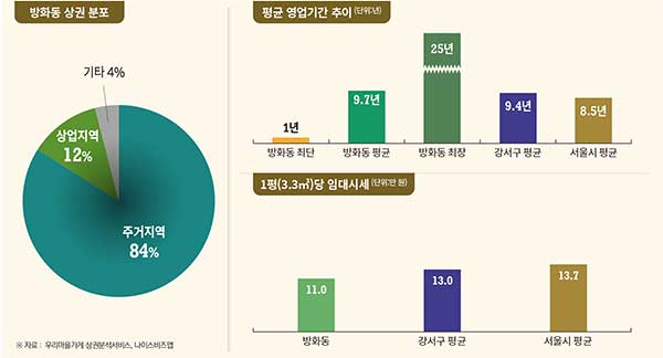 방화동은 방화역을 중심으로 아파트촌과 소규모의 단독주택촌이 위치한 전형적인 항아리상권으로 대부분 상가가 건물 1층에 많이 분포해 있어 다른 층의 임대료와 큰 차이를 나타내는 것이 특징이다.