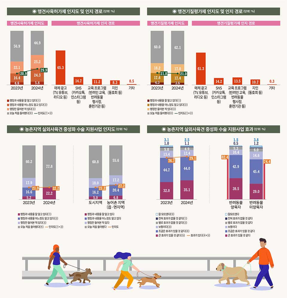 농림축산식품부가 발표한 ‘2024 동물복지에 대한 국민의식조사’에서 전체 응답자를 대상으로 맹견사육허가제의 인지 정도를 조사한 결과, ‘인지하고 있다’는 응답은 29.9%로 2023년 대비 9.0% 증가한 것으로 나타났다. 맹견사육허가제 인지 경로를 살펴보면 ‘매체 광고(TV, 유튜브, 라디오 등)’가 65.3%로 가장 많았고, 그 다음으로 ‘SNS(카카오톡, 인스타그램)’(14.7%), ‘교육프로그램(반려인 교육, 반려동물 행사장, 훈련기관 등)’(11.2%), ‘지인(동호회 등)’(8.3%) 순으로 조사됐다. 반면 맹견기질평가제 인지 정도 조사에서는 ‘인지하고 있다’는 응답이 21%로 2023년 대비 0.8% 감소했다. 맹견기질평가제 인지 경로를 살펴보면 ‘매체 광고’가 61.3%로 가장 많았고, ‘SNS’(14.2%), ‘교육프로그램’(13.5%), ‘지인’(10.7%) 순으로 맹견사육허가제 인지 경로와 같은 순위를 나타냈다. 농촌지역 실외사육견 중성화 수술 지원사업에 대해서는 ‘인지하고 있다’는 응답이 21.9%로 낮게 나타났으나 사업 효과에 대해서는 ‘효과가 있을 것 같다’는 비율이 76.7%로 높게 나타난 반면 ‘효과가 없을 것 같다’는 비율은 6.8%에 그쳤다. <편집자주>