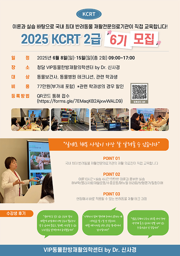 국내 최대 반려동물 재활전문 의료기관 VIP동물한방·재활의학센터 by Dr. 신사경에서 동물병원 스탭 대상 재활 교육 프로그램 ‘2025 KCRT(Korea Canine Rehabilitation Technician) 2급 6기’ 참가자를 모집한다.