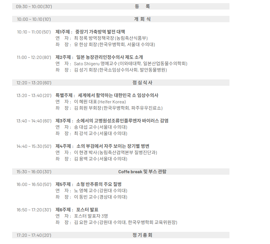 이어 이현경(농림축산검역본부 질병진단과) 박사가 ‘소의 부검에서 자주 보이는 장기별 병변’을, 노영혜(강원대) 교수가 ‘소형 반추류의 주요 질병’을 강의한다. 강의가 끝난 후에는 3인의 포스터 발표 시간도 마련돼 있다.