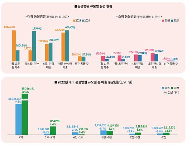 대형 동물병원들은 내원 건당 진료비를 2022년 대비 약 14% 정도 끌어올리며 물가 상승률을 상쇄하고 있다. 이에 비해 소형 동물병원의 내원 건당 진료비는 정체돼 있거나 상승 폭이 미미하다. 진료비를 올려야 한다는 필요성은 인식하고 있지만, 보호자들의 불만을 우려해 적극적인 인상에 어려움을 겪고 있기 때문이다.