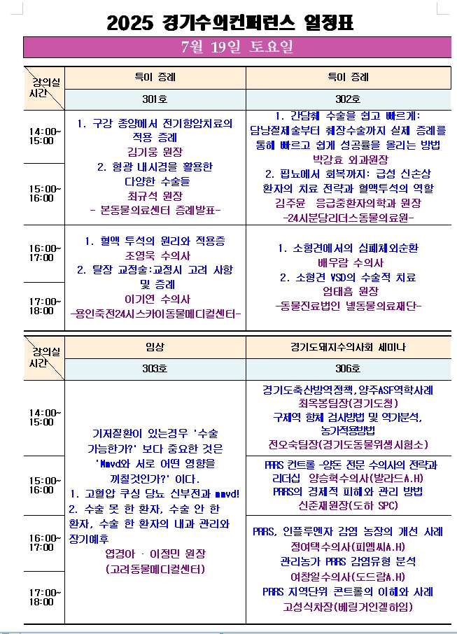행사 첫째 날인 19일(토)에는 다양한 로컬동물병원의 원장과 수의사가 총 3곳의 강의실에서 자신이 경험한 증례를 공유한다.