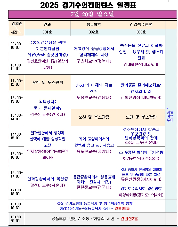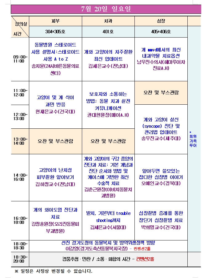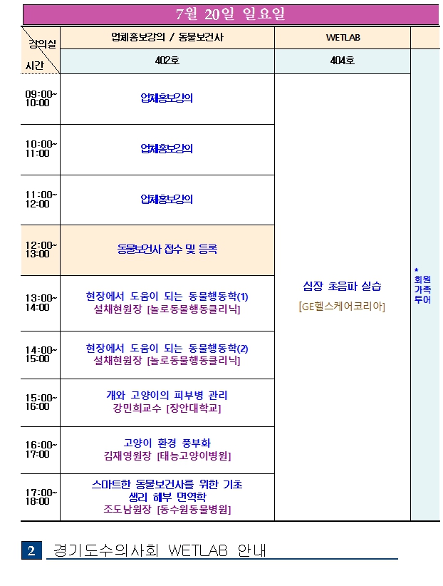 둘째 날인 20일(일)에는 오전 9시부터 오후 6시까지 다양한 주제의 임상 강의를 비롯해 심장초음파 실습, 동물보건사 연수교육, 업체 홍보강의 시간이 준비돼 있다.