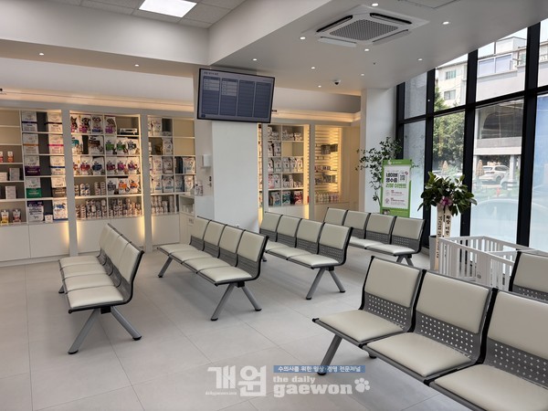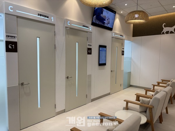 원무 창구와 강아지 대기실 및 고양이 의료센터가 위치한 1층에는 인원에 비해 부족했던 원무 창구를 대폭 확대하고, 강아지 대기실과 고양이 의료센터를 완벽 분리했다. 고양이 의료센터에서는 ‘고양이 스트레스 제로 프로젝트’를 통해 반려묘의 심리적 안정까지 고려한 특별한 진료 환경을 제공하고 있다.