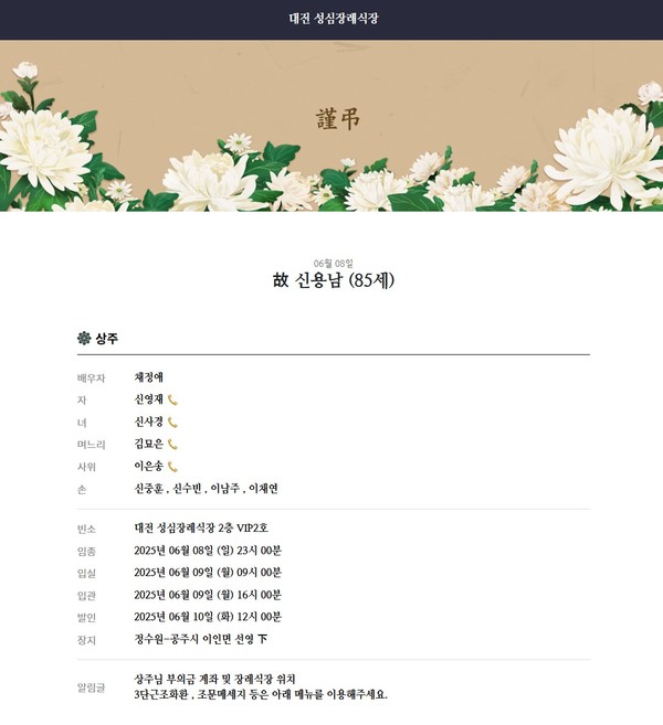 빈소: 대전 성심장례식장 2층 VIP2호(주소: 대전광역시 서구 갑천도시고속도로 1893(월평동)