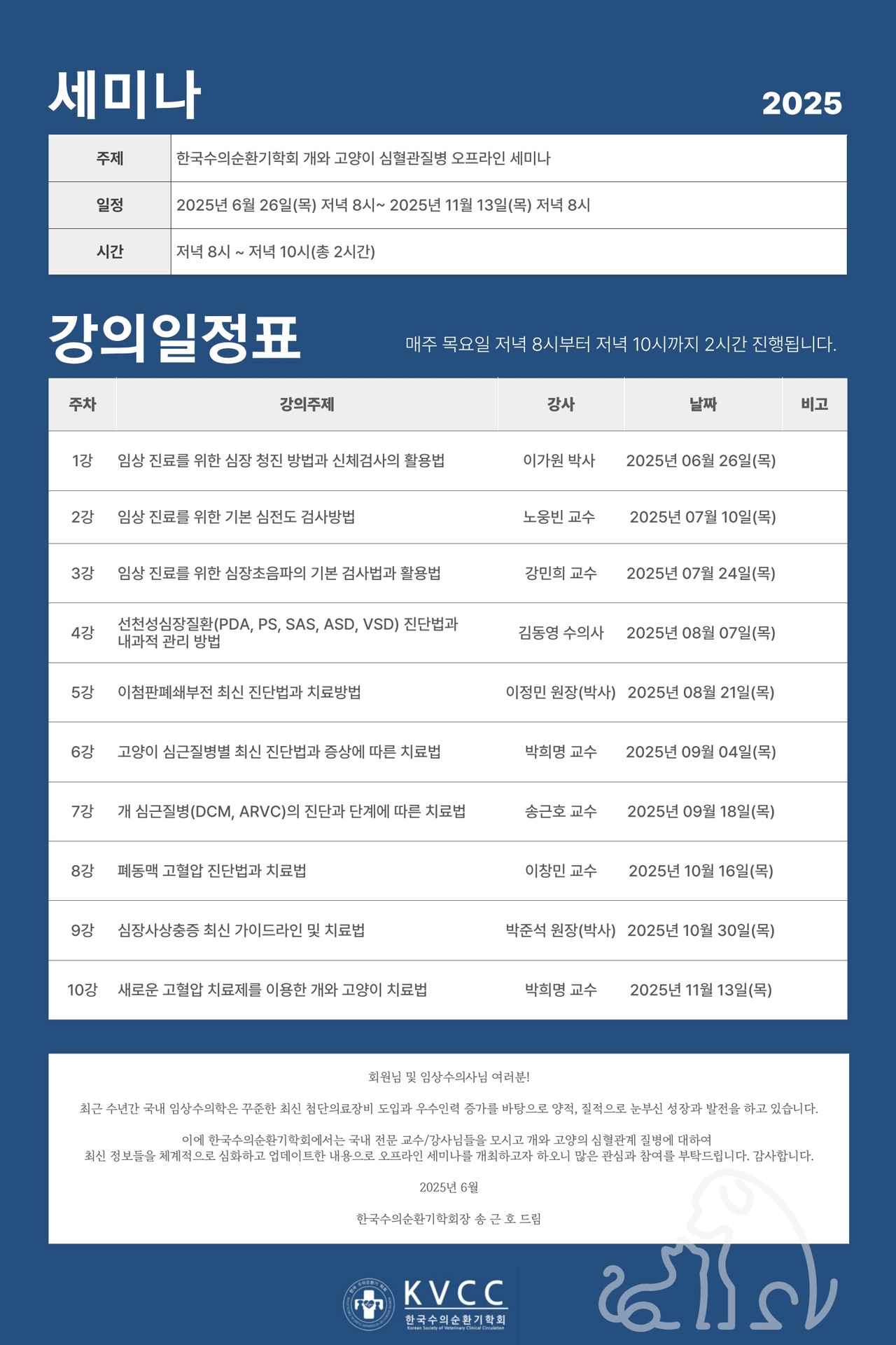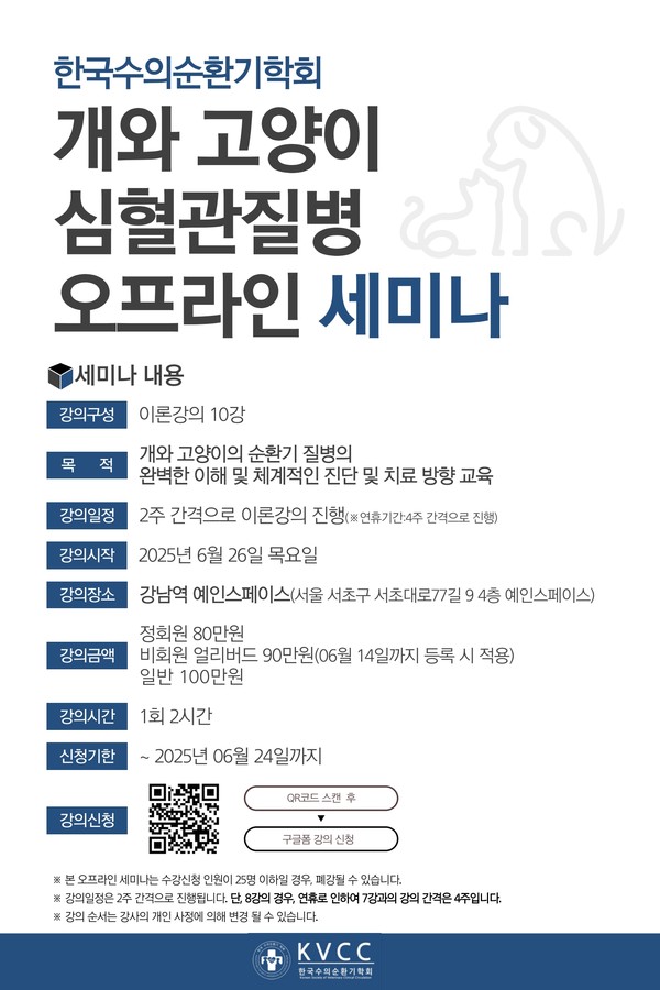 한국수의순환기학회(회장 송근호, 이하 KVCC)가 ‘개와 고양이 심혈관질병 오프라인 세미나’를 오는 6월 26일(목)부터 11월 13일(목)까지 총 10강에 걸쳐 개최한다. 총 10회의 오프라인 세미나 중 7회 이상 참석 시 수료증도 발급된다.