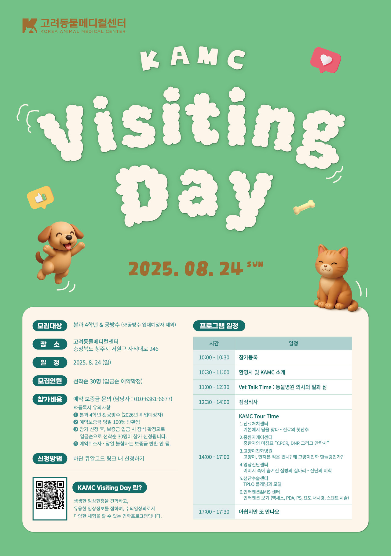 이번 행사는 △환영사 및 KAMC 소개 △Vet Talk Time: 동물병원 의사의 일과 삶 △점심식사 △KAMC Tour Time 순으로 진행될 예정이다.