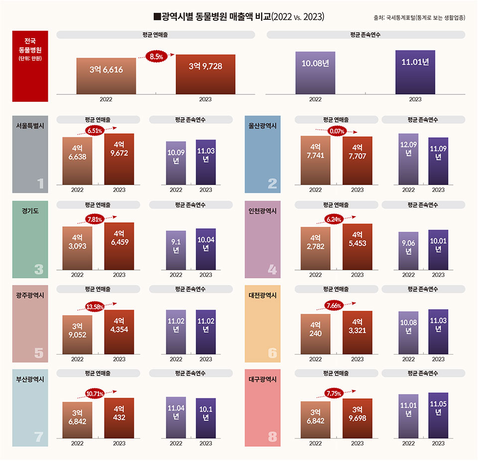 국세통계포털이 제공하는 ‘통계로 보는 생활업종’에 따르면, 귀속연도 2023년 기준 전국 동물병원의 평균 연 매출은 3억 9,728만 원으로 나타났다. 이는 전년 대비 8.5% 증가한 수치이며, 평균 사업 존속연수는 11년 1개월이다. 본지가 서울시와 경기도 6개 광역시의 동물병원 매출액을 비교한 결과, 서울시가 4억 9,672만 원으로 가장 높은 연 매출을 기록했다. 6개 광역시 중에서는 울산광역시가 4억 7,707만 원으로 가장 높았고, 인천광역시와 광주광역시가 각각 4억 5,453만 원, 4억 4,354만 원으로 그 뒤를 이었다. 또한 평균 사업 존속연수 역시 마찬가지로 울산광역시가 11년 9개월로 가장 길었으며, 서울시와 경기도, 6개 광역시 모두 10년 이상의 평균 사업 존속연수를 기록했다. <편집자주>