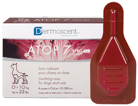 세계적으로 유명한 프랑스 프리미엄 동물용 스킨케어 브랜드 ‘더모센트(Dermoscent)’의 제품인 ‘아톱 7 스팟온’은 100% 천연 필수지방산, 세라마이드, 에센셜 오일 등 식물 유래 성분으로 아토피 피부염 및 알러지성 피부로 인해 손상된 피부 장벽을 회복시키고 수분 공급에 도움을 준다.