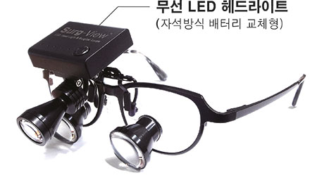 ‘써지뷰 무선 LED 헤드라이트’는 수술용 LED 램프로 유명한 미국 Cree사의 고휘도 LED 램프를 사용한 제품으로 밝고 선명한 시야를 제공할 수 있다. 모든 형태의 루페 및 안경에 착용할 수 있는 클립형 초경량 헤드라이트로 많은 인기를 얻고 있다.