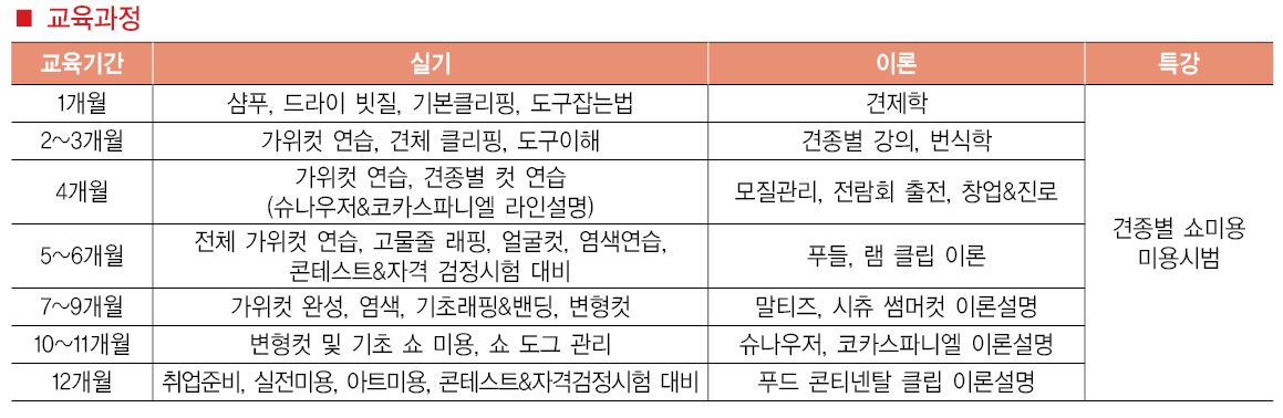 반려동물 산업의 가파른 성장세로 애견미용이나 수의간호사 등 관련 직종이 21세기 유망직종을 넘어 하나의 전문 직업인으로서 각광받고 있는 가운데, 애견미용 기술뿐만 아니라 이론적인 지식까지 동시에 겸비한 애견미용의 진정한 프로를 양성하는 학원이 있다.
