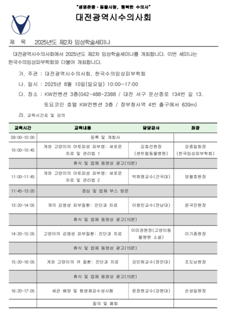 대전수의사회(회장 정기영)가 주최하는 ‘2025년도 제2차 임상학술세미나’가 오는 8월 10일(일) 오전 10시부터 오후 5시까지 대전 KW컨벤션센터 3층에서 진행된다.