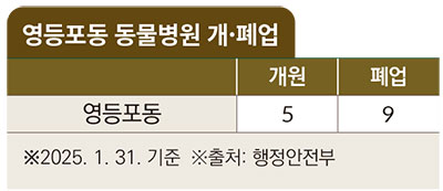 행정안전부 최신 데이터에 따르면, 영등포구 영등포동은 2001년부터 동물병원이 개원하기 시작해 2025년 1월 31일 기준 14개소가 개원, 이 중 9개소(64%)가 문을 닫고, 현재 5개소(36%)가 개원을 유지하고 있다.