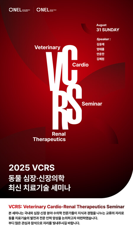 넬동물의료재단(이사장 윤일용) 주최하는 ‘2025 VCRS(Veterinary Cardio-Renal Advanced Therapeutics Seminar)’ 세미나가 8월 31일(일) 오전 10시부터 오후 6시까지 서울 마곡 코엑스 컨벤션센터에서 열린다.