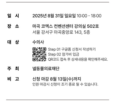 이번 세미나는 수의사를 대상으로 하며 참가 신청은 8월 13일(수)까지 QR코드를 통해 하면 된다. 참가비는 5만 원이다.